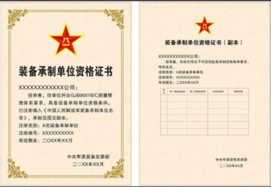 现武器装备质量管理体系与装备承制单位资格审查实行 “两证合一” 政策,“两证合一”,是指将武器装备质量管理体系审核与装备承制单位资格审查两项活动,合并为统一组织实施的装备承制单位资格审查活动,一次审查作出结论,发放一个证书,即装备承制单位资格证书,并标明满足国家军用标准质量管理体系要求。
